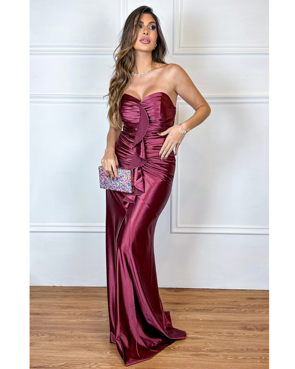 Vestido longo prada tomara que caia babados com drapeado.